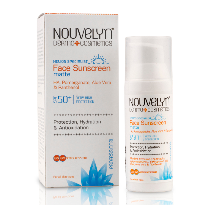Αντηλιακή κρέµα για το πρόσωπο και τον λαιµό με Υαλουρονικό οξύ, Ρόδι, Aloe Vera & Πανθενόλη η οποία αντικαθιστά κάλλιστα την κρέμα ημέρας προσδίδοντας ματ εμφάνιση στο δέρµα. Προσφέρει υψηλή προστασία από την UVA & UVB ηλιακή ακτινοβολία και προστασία από την επιβλαβή δράση των ελεύθερων ριζών.